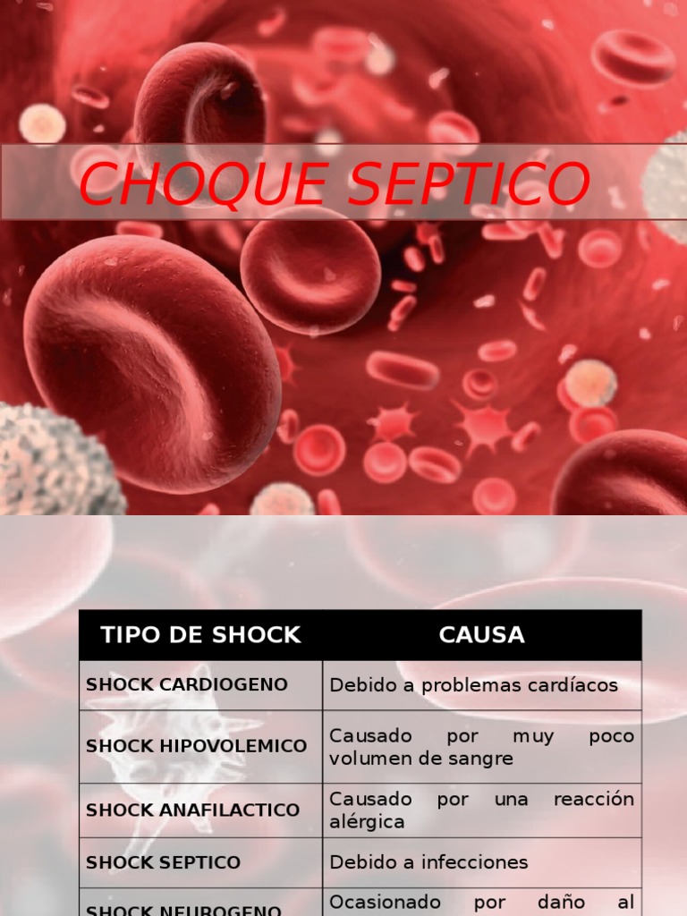 El término choque (o shock) 1 puede referirse: Medicinanet informações de medicina s/a av. Una emergencia médica de peligro para la vida; Septic shock is a potentially fatal medical condition that occurs when sepsis, which is organ injury or damage in response to infection, leads to dangerously low blood pressure and abnormalities in cellular metabolism. Choque circulatorio o shock circulatorio, un problema de salud grave que se caracteriza por hipoperfusión e hipoxia; Los pacientes fallecen por complicaciones (fallo multiorgánico, choque séptico) entre el día 6 y el 16 de la enfermedad. Ningún caso grave mejora a partir de los seis a once días. Ningún caso grave mejora a partir de los seis a once días. A un choque emocional o shock emocional, una emoción que, por su intensidad, genera cambios fisiológicos;;